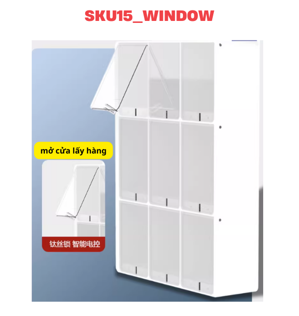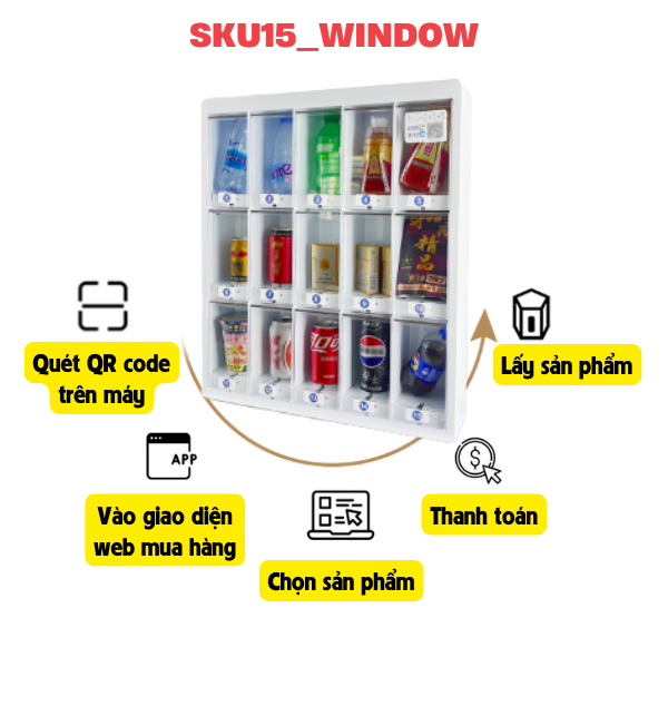 - 15 ô sản phẩm có cửa riêng từng ngăn, mở–đóng tự động sau thanh toán.