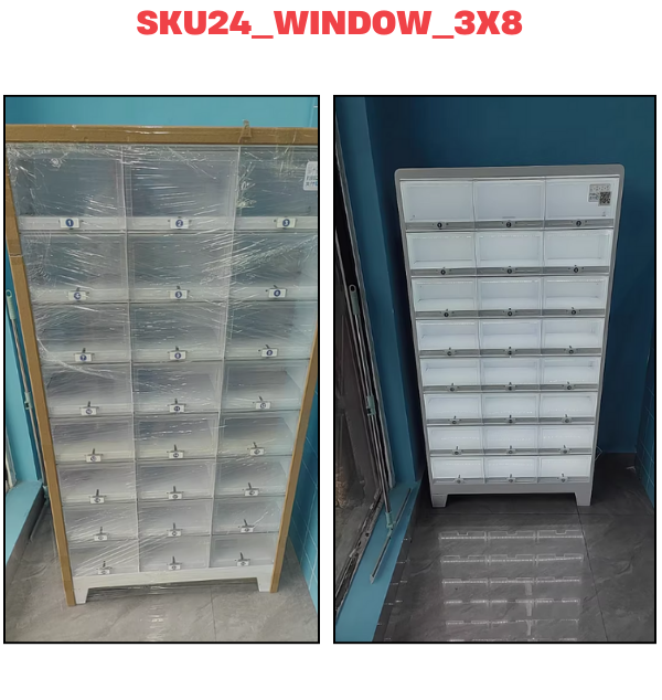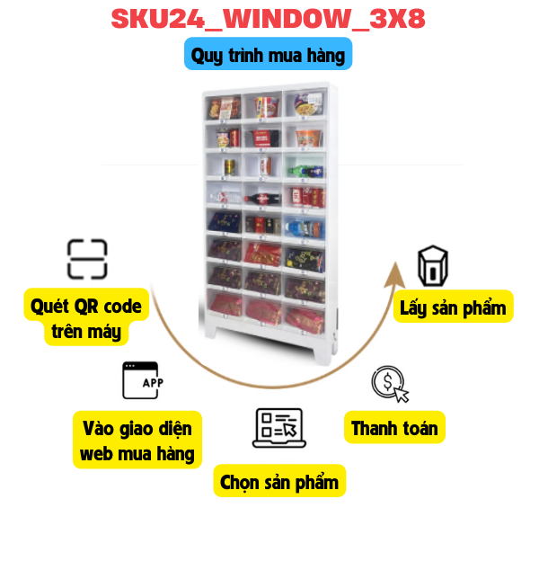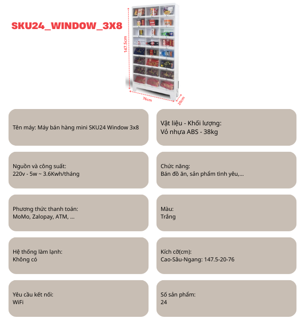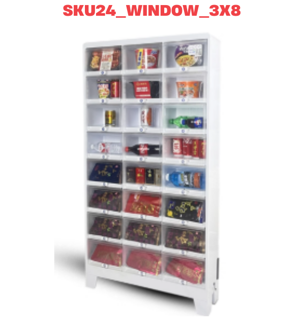 Máy bán hàng tự động mini VNVENDING – SKU24 Window 3x8 là dòng máy công suất lớn, phù hợp khách sạn, ký túc xá, chung cư, văn phòng, quán game và các khu vực có lưu lượng khách cao. Máy hỗ trợ thanh toán bằng mã QR, ví điện tử và thẻ ATM – hoạt động hoàn toàn tự động 24/7.